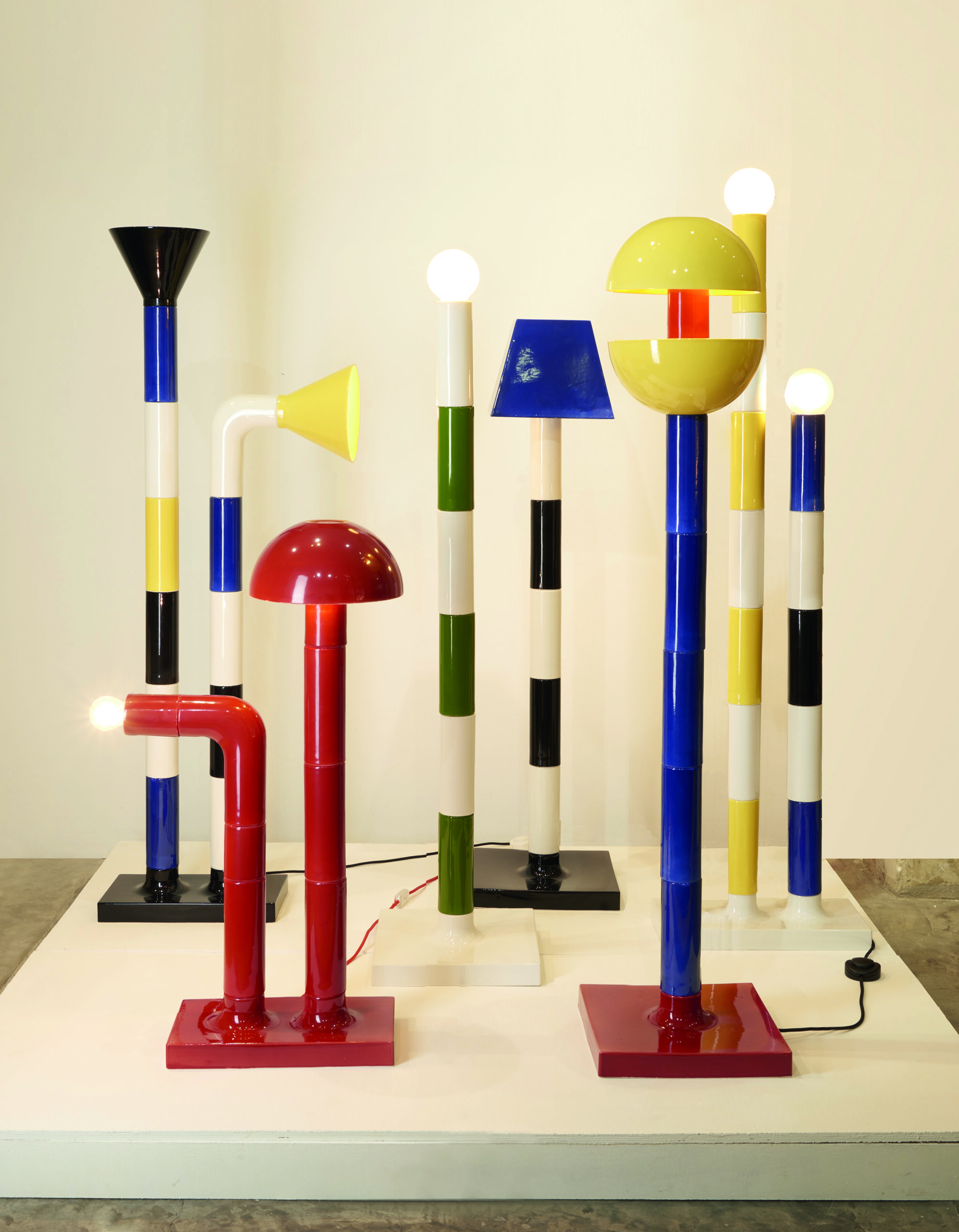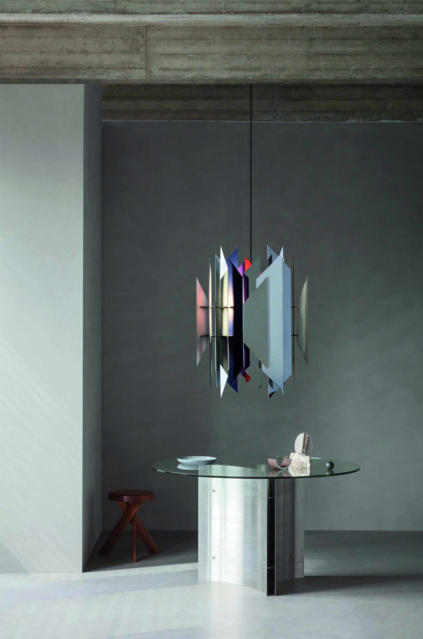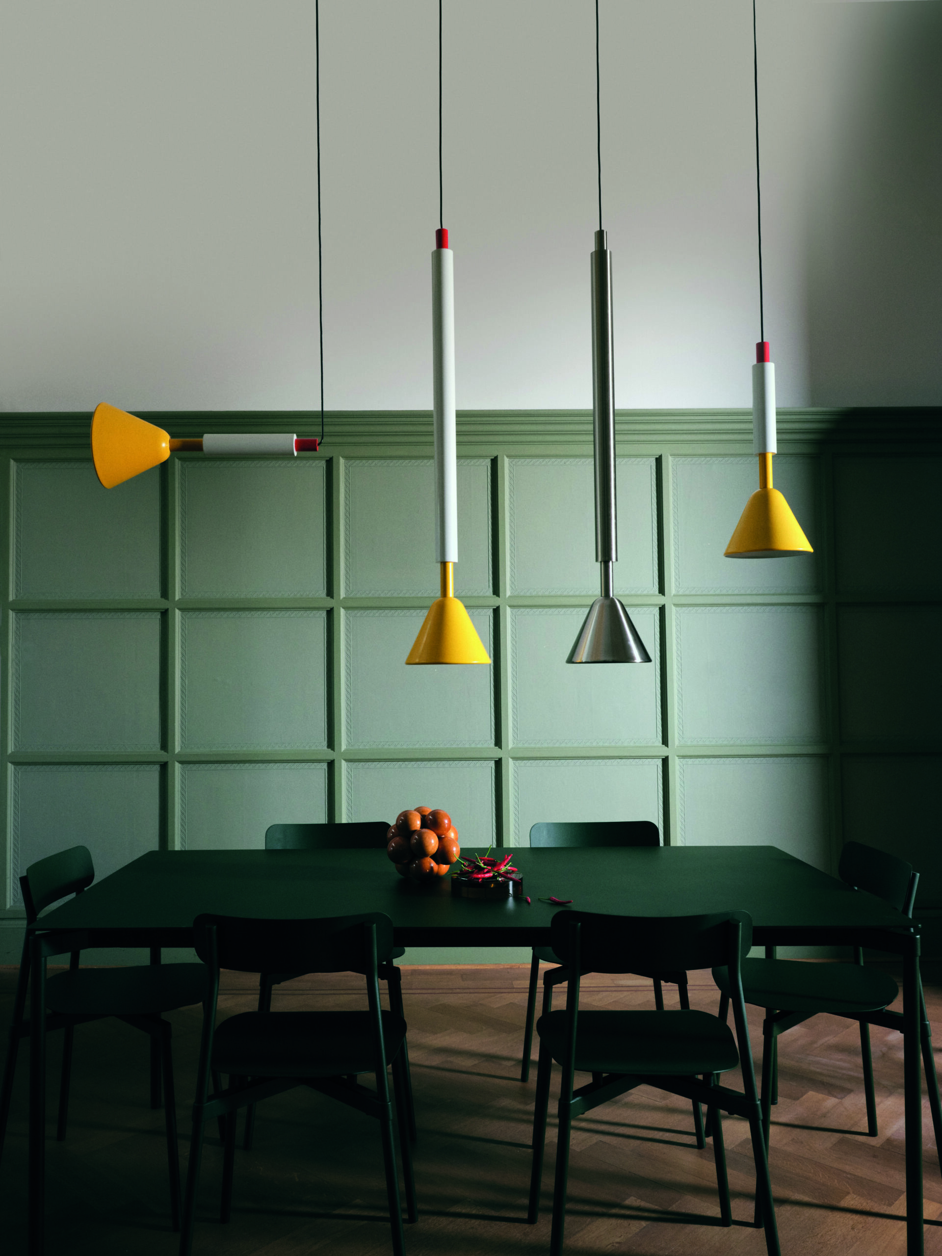 La force technique réside ici dans le jeu des matériaux : des cadres en acier poli ou peint avec des diffuseurs en verre transparent, le tout alimenté par des LED à intensité variable. Tous les objets de la collection, des suspensions aux lampadaires en passant par les plafonniers et les appliques murales, se suffisent à eux-mêmes, mais déploient tout leur potentiel lorsqu’ils sont réunis, créant ainsi un rythme unique de formes et de couleurs. Et la palette de couleurs ? Elle s’inspire du design italien : du jaune vif et du rouge piment avec des tonalités neutres de blanc, de noir et d’acier brut.