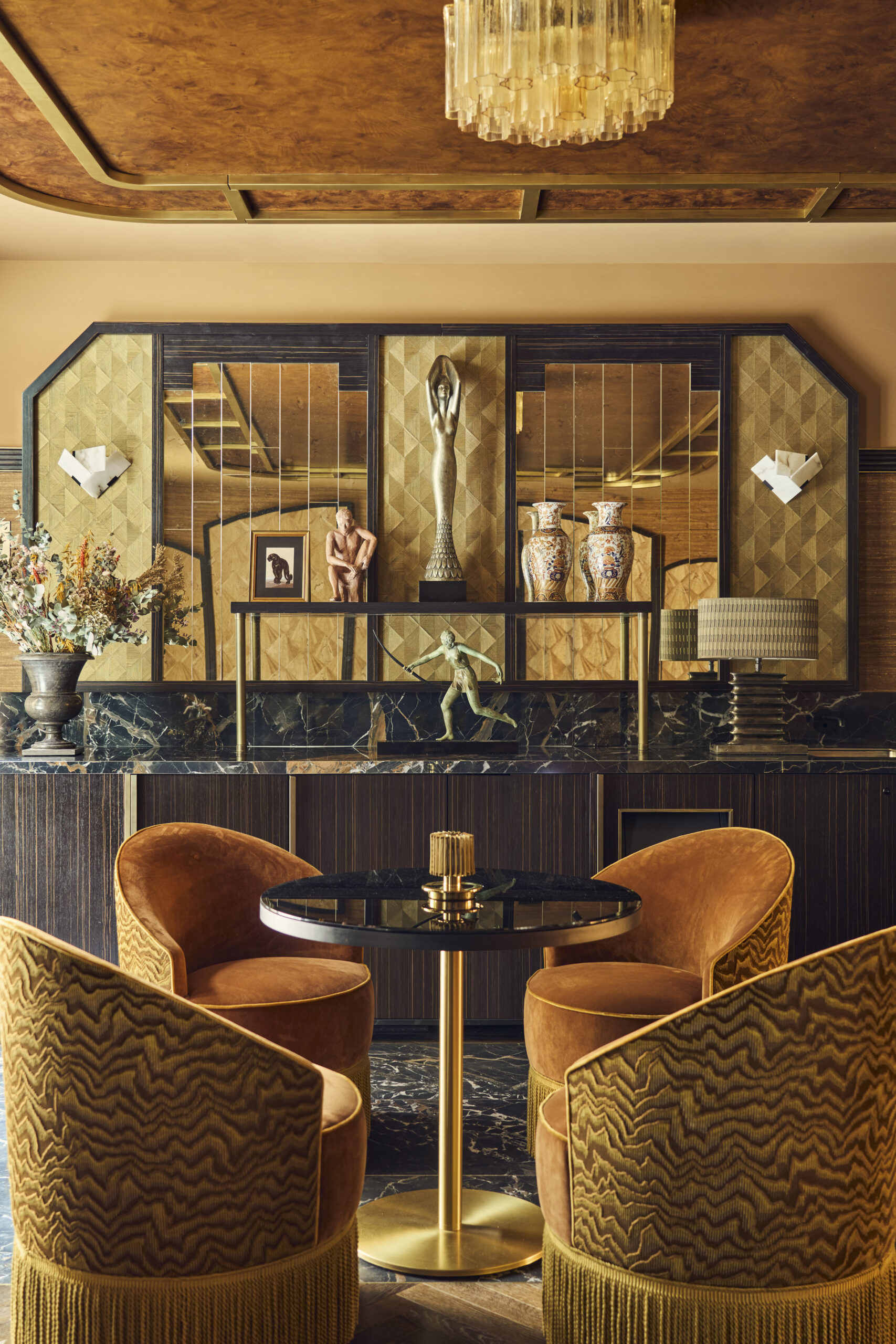Derrière sa façade haussmannienne, cet hôtel-boutique dissimule un lieu hybride empruntant au boudoir et au cabinet de curiosité, son élégance raffinée et ses codes réinterprétés. Reflets dorés, lignes géométriques, effets de symétrie, parquet à chevrons, détails de marqueterie, mosaïque étincelante… un parfum des années folles flotte dans l’air. Les peintures décoratives de l’artiste Cédric Peltier font écho à l’esthétique de l’affichiste et illustrateur Cassandre, créateur du logo YSL d’Yves Saint-Laurent, au décorateur et laqueur Jean Dunand. Réédition par MCDE, les appliques murales en albâtre Mouche ont été dessinées par Pierre Chareau, en 1924. Elles côtoient des lustres en verre de Murano. Soulignés par les encadrements de portes, façon ronce de noyer et faux marbre, le mobilier en ébène de Macassar et les paravents en soie sauvage des espaces communs se mêlent aux pièces vintage et aux détails exotiques. Tandis que des motifs animaliers et des dessins d’oiseaux, ornant les dossiers des fauteuils, les tapis et les rideaux dialoguent avec des bustes et statues néoclassiques.