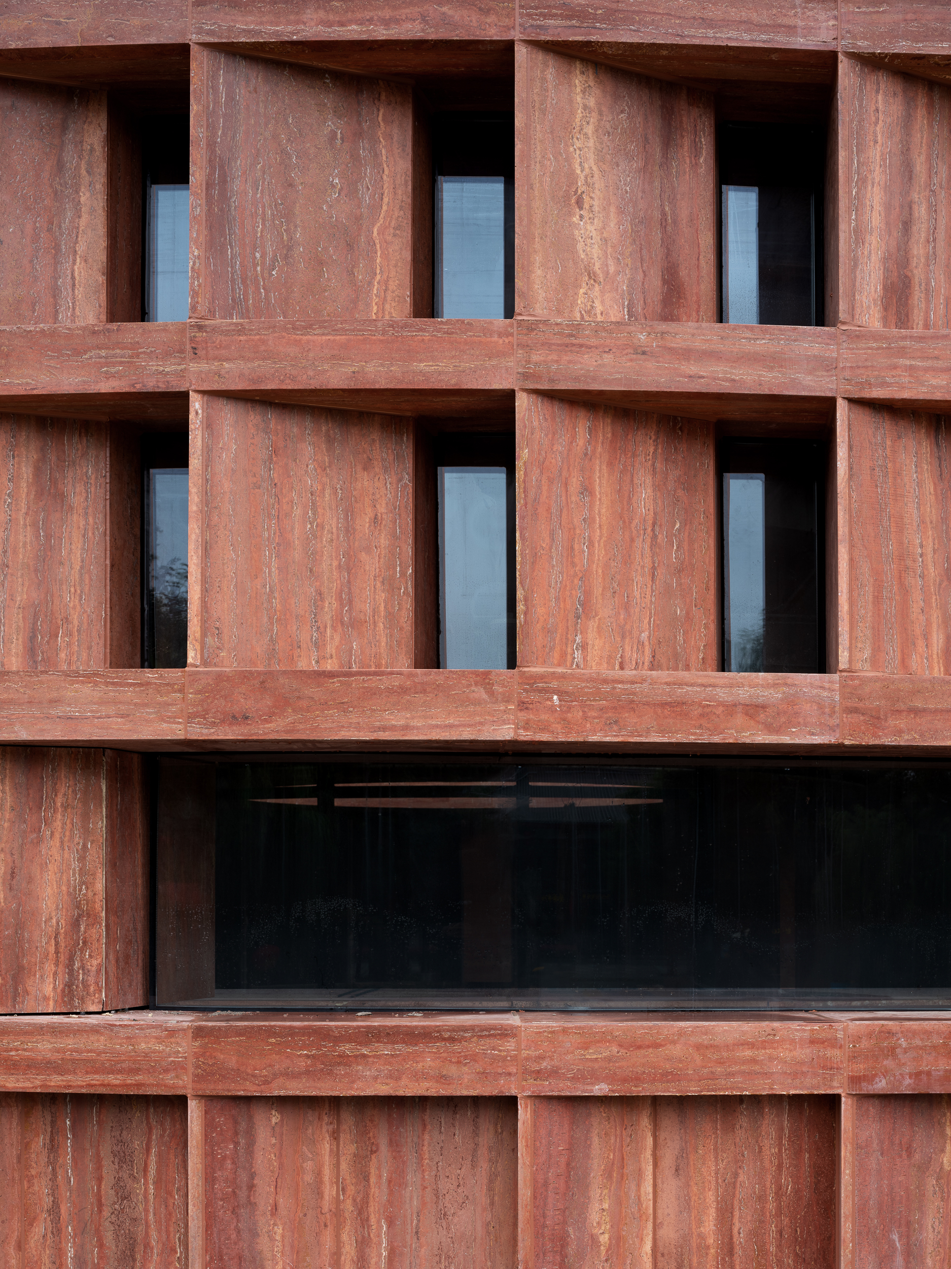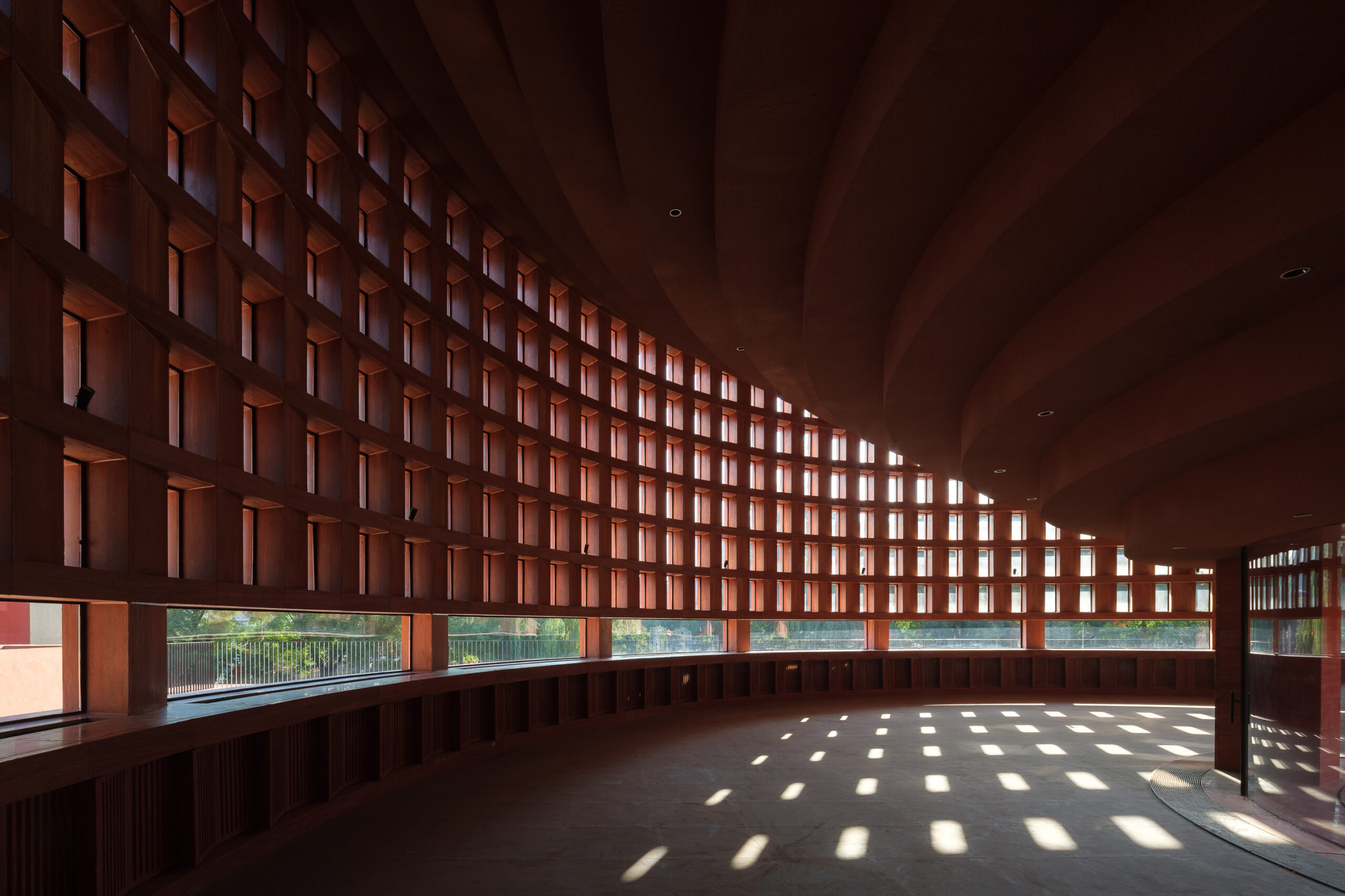 Het historische gebouw van het Qujiang Museum voor Schone Kunsten in de wijk Datang Everbright City van Xi’an kreeg als uitbouw een fel contrasterend stadsmonument. Het ontwerp van studio Neri&Hu Design and Research Office troont bij de ingang van het oorspronkelijke gebouw en huisvest er de uitgebreide culturele en commerciële functies van de instelling. Het nieuwe architecturale hoogstandje is vierdelig: een gedeeltelijk ingegraven sokkel, een sculpturale circulatiezone, een platform dat oogt als een podium en boven alles uitstekend het amfitheater. De sokkel die gedeeltelijk geïntegreerd is met het bestaande plein zit in een betonnen plaat ingewerkt, in het verlengde van het oorspronkelijke terrein. Het project moet vooral het beheer van de communicatieruimten verbeteren, zonder afbreuk te doen aan de al ingerichte delen en maakt gebruik van de vrije volumetrie. Het metselwerk voor de gevel van het amfitheater, bestaande uit rood travertijn in ruitvorm, kreeg een dubbele laag hol glas met lage uitstoot. Een dergelijke wandconfiguratie optimaliseert zowel de lichttransmissie als het warmtebehoud, wat de natuurlijke verlichting ten goede komt en de kosten voor verwarming en airco beperkt.
