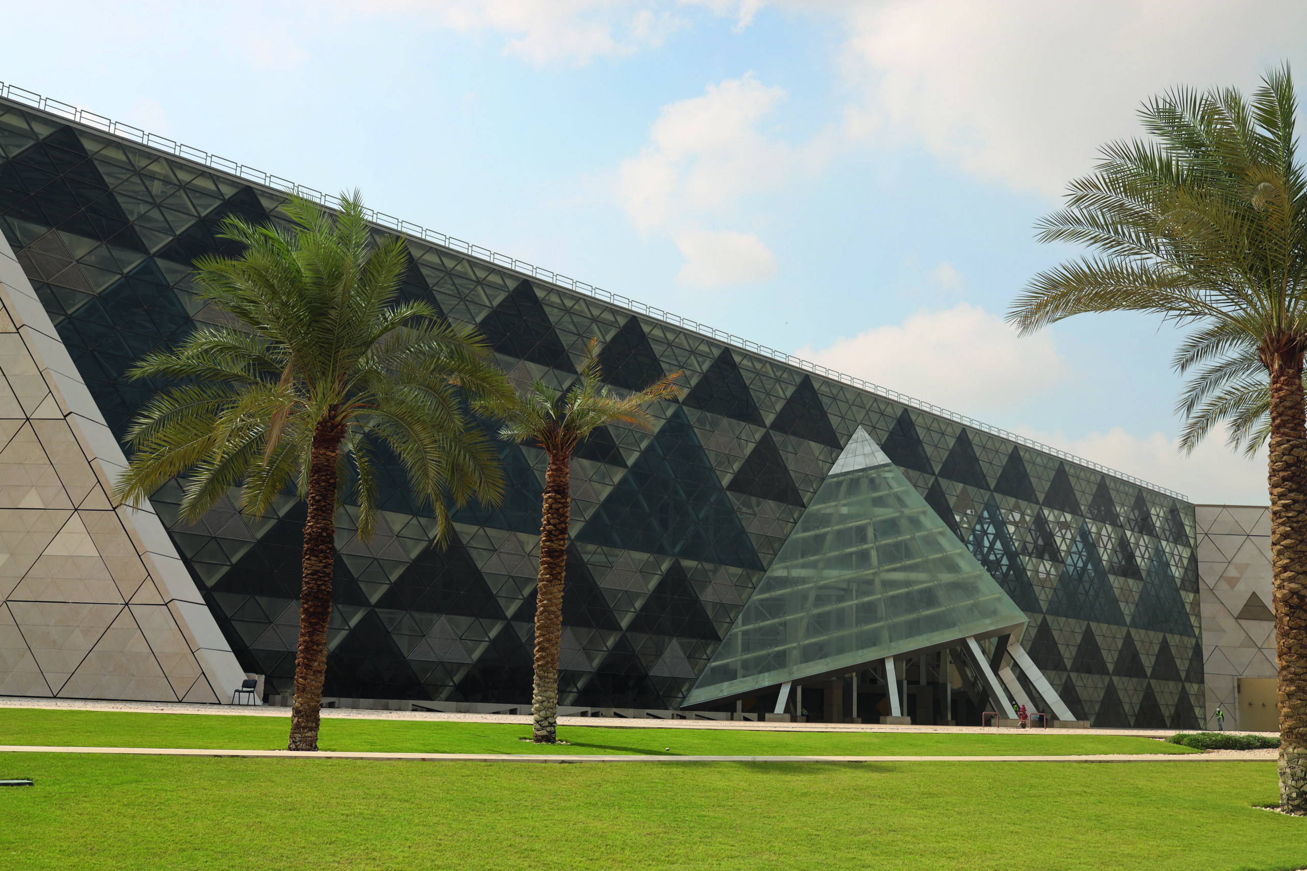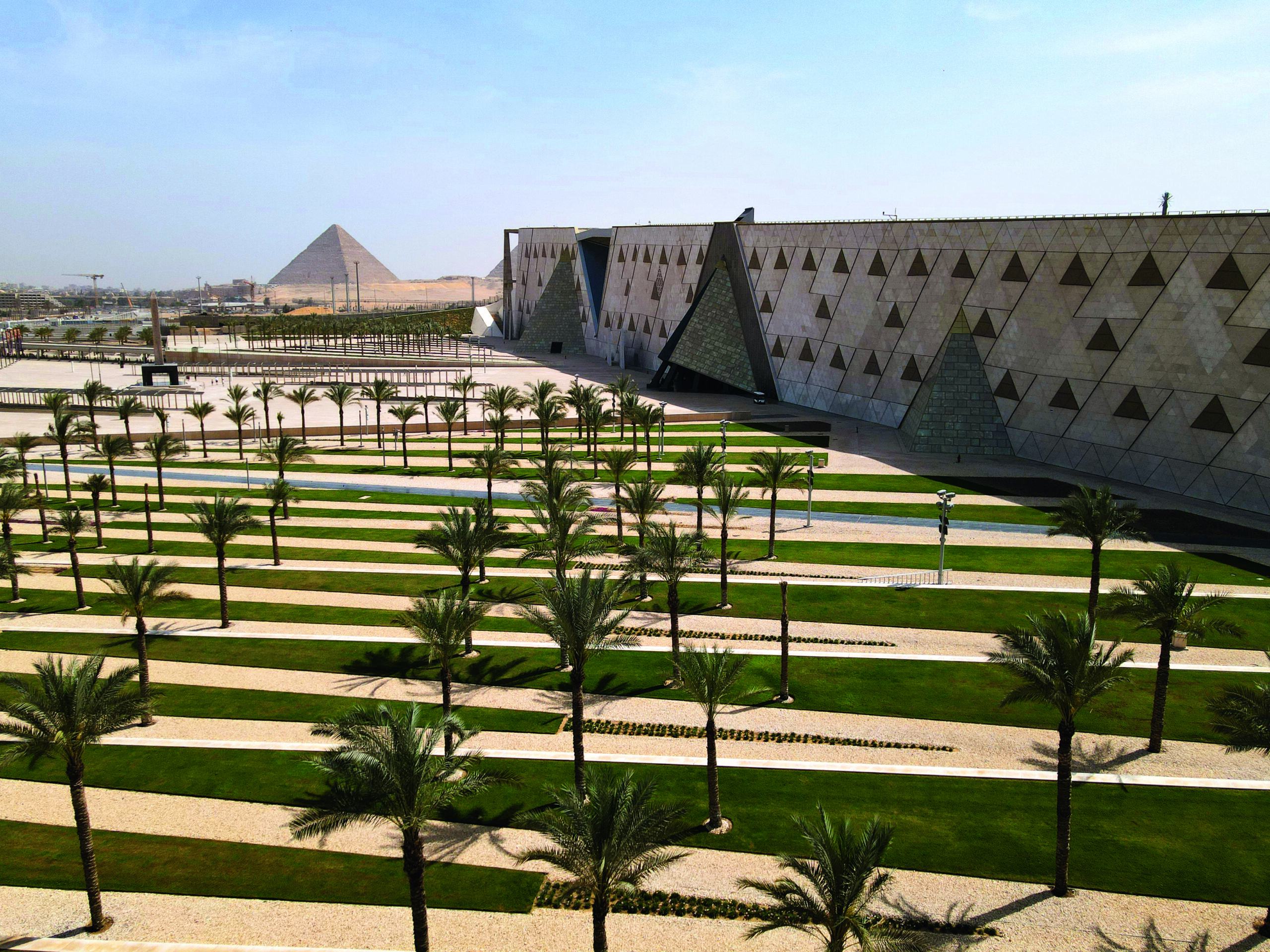 Designed as a monumental concrete wedge, the GEM follows the natural lines of the landscape: balancing on the edge of the Nile Delta and a desert plateau. In the museum’s interior, the triangle recurs throughout: in the inverted pyramid-shaped pillars at the main entrance, resembling giant stilettos, and in successive floors leading to the permanent collections via the central staircase. The higher you climb, the deeper you delve into history. The top rewards with a panoramic view of the pyramids: the circle – or rather triangle – is complete.